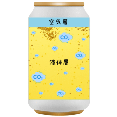 炭酸飲料の缶の中では、炭酸ガス(CO₂)が液体の中に